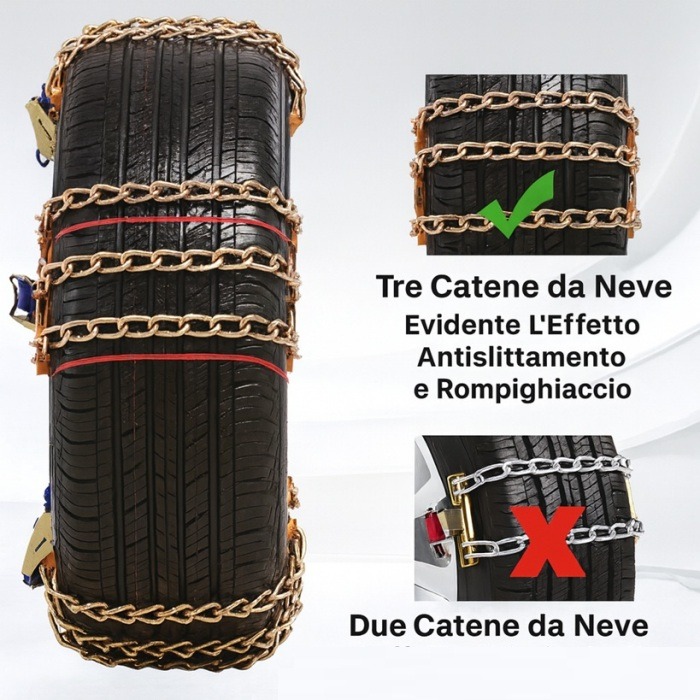 Guidare su strade innevate senza catene da neve omologate può metterti seriamente in pericolo e farti rischiare multe salate. In Italia, la legge prevede l’obbligo di avere catene a bordo o montate durante il periodo invernale, anche se non nevica al momento. Con le nostre catene facili da montare sei sempre pronto a ogni evenienza: garantiscono aderenza ottimale, stabilità in curva e massima sicurezza anche su ghiaccio o neve. Evita sanzioni da oltre 300 € e affronta l’inverno senza pensieri, proteggendo te, i tuoi passeggeri e la tua auto con una soluzione pratica, resistente e sempre conforme alle norme stradali.
