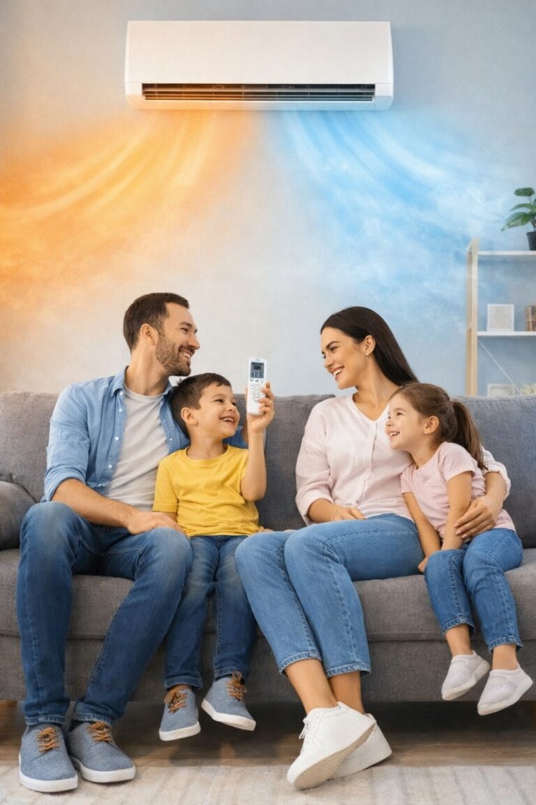 Con AirComfort Pro® no necesitas tener un aparato diferente para cada estación, su tecnología 2 en 1 produce aire caliente para los días fríos y aire frío cuando suben las temperaturas, sin una incómoda unidad exterior colgada en la fachada
