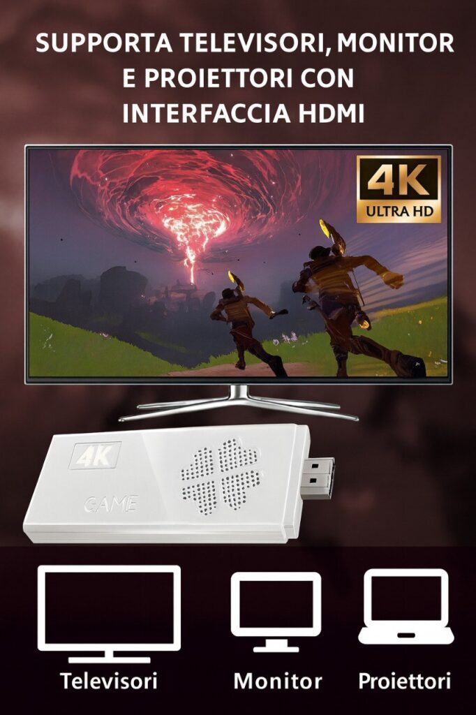 La GameStick™ si collega in pochi secondi grazie al cavo HDMI incluso nella confezione. Non servono adattatori, tecnici o installazioni complesse: basta inserire la pennetta e il gioco è fatto.