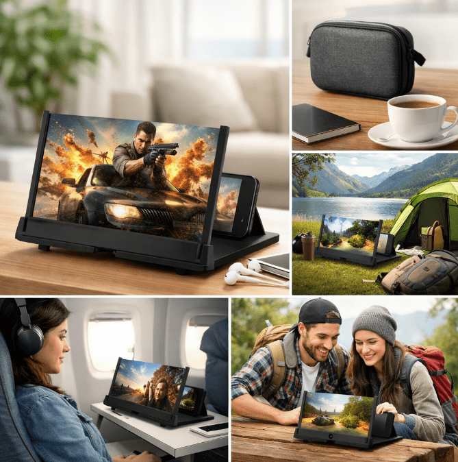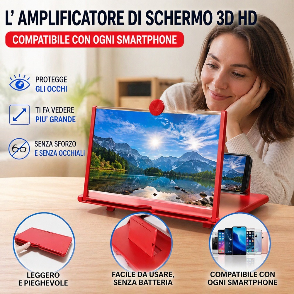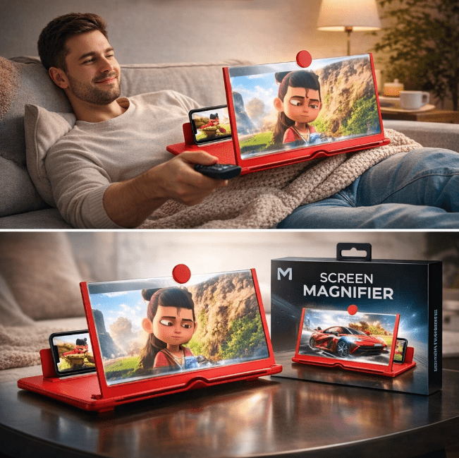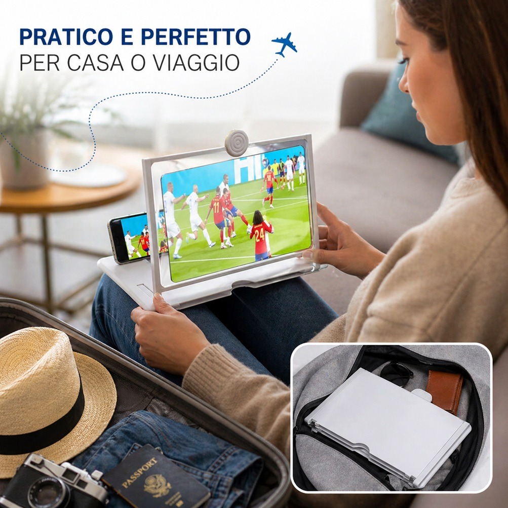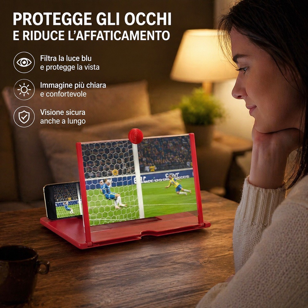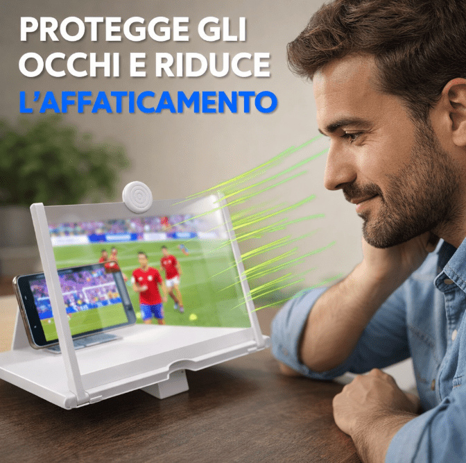 Guardare video, film o partite direttamente dal cellulare per molto tempo può affaticare la vista e provocare fastidio agli occhi. Con l’Amplificatore Schermo HD tutto cambia: lo schermo viene ingrandito fino a 3-4 volte, permettendoti di vedere ogni dettaglio con maggiore chiarezza e riducendo lo sforzo visivo.