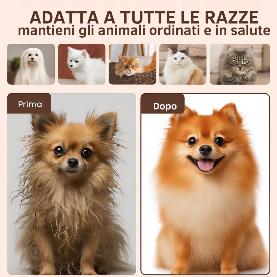 "Gatto persiano = peli ovunque. Ora casa pulita e lui si rilassa durante la toelettatura. Setole morbide e design comodissimo!"