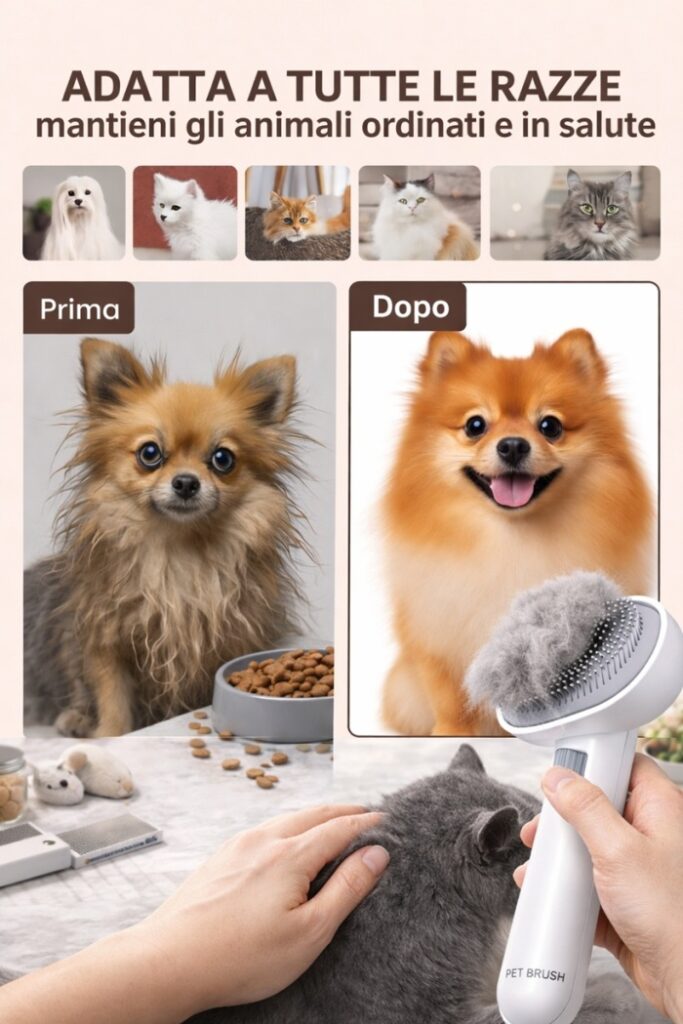 Dimentica peli ovunque in casa, nodi impossibili da sciogliere, animali nervosi e irritati. Grazie al suo design intelligente e alle setole flessibili in acciaio inox, questa spazzola rispetta la pelle, scioglie i nodi senza dolore e rende il pelo più sano e lucido. Non è una semplice spazzola: è un trattamento di benessere per il tuo animale.